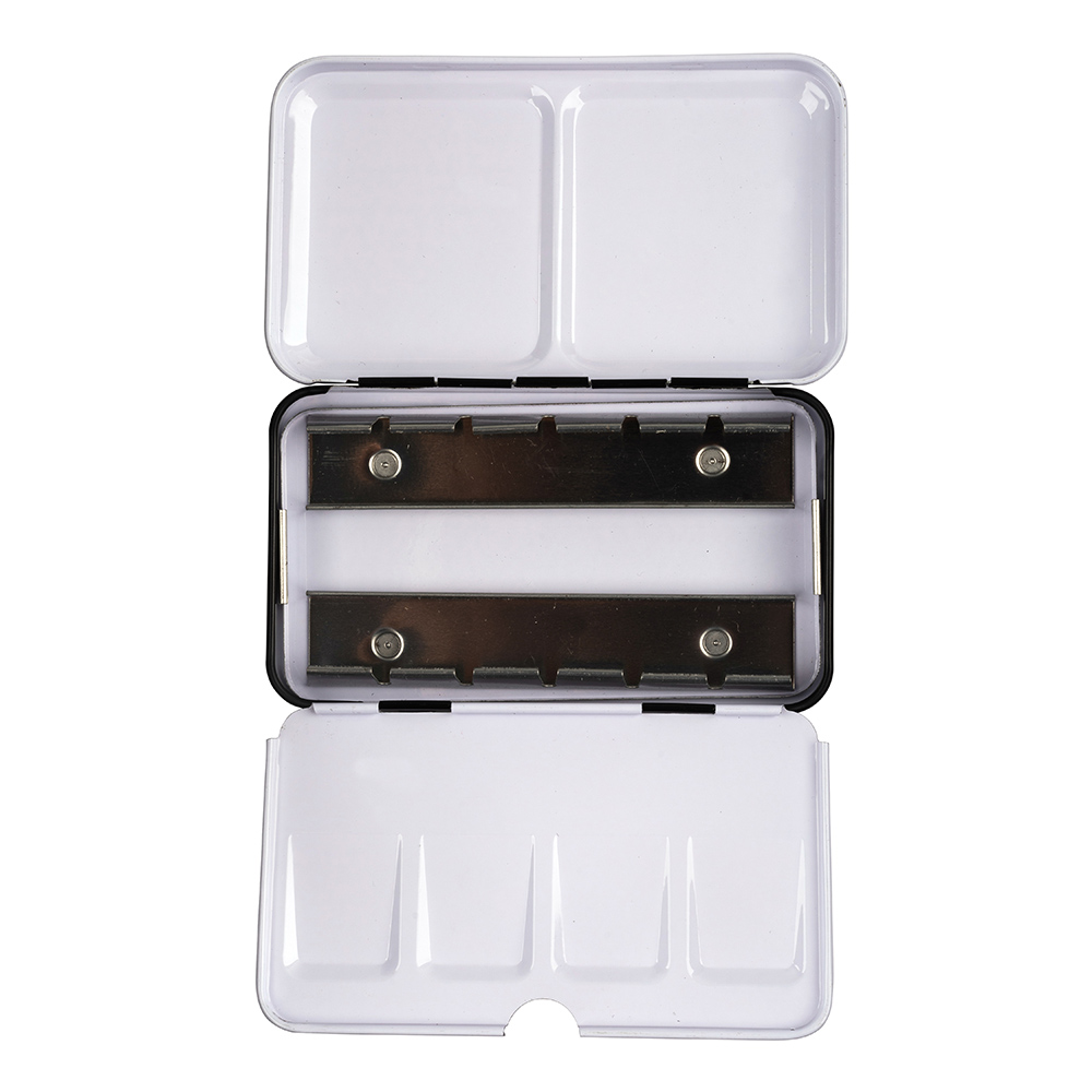 The palette for watercolours is made from metal sheet in black colour. The inner part of the palette is white. There is a loop in the lower side to grasp the palette. There is a metal insert inside to attach 12 cuvettes of watercolours.