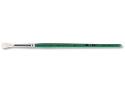 Round brush for schools. Round brush size 6, green varnished shank, chrome-coated quiver. Wooden shank, metal quiver (chrome-coated), “goat” hair. Size: 6 mm, hair diameter: 4 mm, hair length: 19 mm, quiver length: 30 mm, shank length: 135 mm.