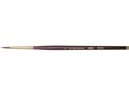 Round brush for artistic purposes. Round artistic brush size 2, Cologne hair for watercolours. Plastic cover on the brush hairs as a protector against fraying. Wooden handgrip in wine red design, brush end soaked in quiver shade. Wooden shank, brass quiver – gold colour, seamless, “Cologne – weasel” hair. Total brush length: 180 mm, hair length: 12 mm, hair diameter: 2 mm.