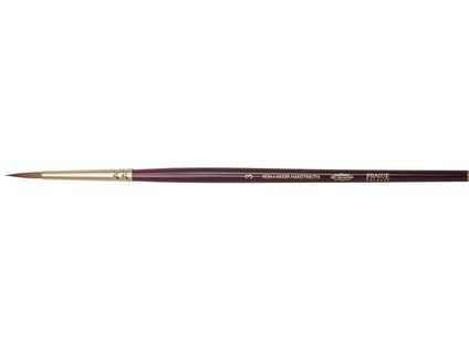 Round brush for artistic purposes. Round artistic brush size 3, Cologne hair for watercolours. Plastic cover on the brush hairs as a protector against fraying. Wooden handgrip in wine red design, brush end soaked in quiver shade. Wooden shank, brass quiver – gold colour, seamless, “Cologne – weasel” hair. Total brush length: 182 mm, hair length: 14 mm, hair diameter: 2 mm.