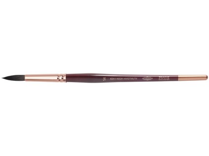 Round brush for artistic purposes. Round artistic brush size 14, squirrel hair for watercolours and gouache. Plastic cover on the brush hairs as a protector against fraying. Wooden handgrip in wine red design, brush end soaked in quiver shade. Wooden shank, brass quiver – copper colour, seamless, “squirrel” hair. Total brush length: 212 mm, hair length: 27 mm, hair diameter: 6 mm.