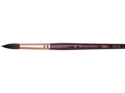 Round brush for artistic purposes. Round artistic brush size 18, squirrel hair for watercolours and gouache. Plastic cover on the brush hairs as a protector against fraying. Wooden handgrip in wine red design, brush end soaked in quiver shade. Wooden shank, brass quiver – copper colour, seamless, “squirrel” hair. Total brush length: 221 mm, hair length: 32 mm, hair diameter: 9 mm.