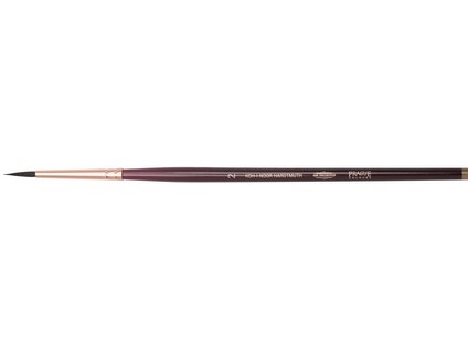 Round brush for artistic purposes. Round artistic brush size 2, squirrel hair for watercolours and gouache. Plastic cover on the brush hairs as a protector against fraying. Wooden handgrip in wine red design, brush end soaked in quiver shade. Wooden shank, brass quiver – copper colour, seamless, “squirrel” hair. Total brush length: 182 mm, hair length: 12 mm, hair diameter: 2 mm.