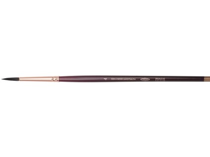 Round brush for artistic purposes. Round artistic brush size 4, squirrel hair for watercolours and gouache. Plastic cover on the brush hairs as a protector against fraying. Wooden handgrip in wine red design, brush end soaked in quiver shade. Wooden shank, brass quiver – copper colour, seamless, “squirrel” hair. Total brush length: 189 mm, hair length: 15 mm, hair diameter: 3 mm.