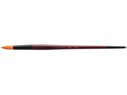 Round synthetic brush for art purposes. Brush size No. 10. The brush has natural varnished shank in red wine colour, synthetic orange hair and aluminium quiver, black varnish. The brush end has black soaking in quiver tone. The brush is suitable for acrylic paints. Tip-shaped hair and protected with plastic cover to protect the hair against damage. The brush length is 326,5 mm. The hair lenght is 34,5 mm.