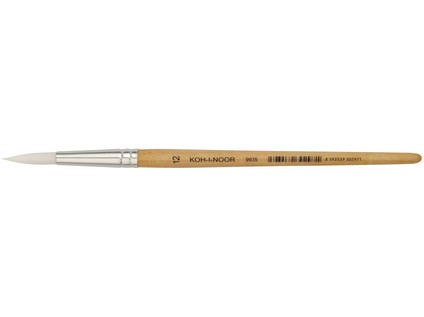 Round synthetic brush for school purposes. Brush size 12. It has natural varnished shank, synthetic white hair and aluminium quiver. Hair length 27 mm, hair diameter 6,2 mm, handle 135 mm long. Glued-in hair and protected with plastic cover to protect the hair against damage. Tip-shaped glued hair; it can therefore be used for colouring as well as contouring of thin things. Round brush size 12, natural shank varnished with transparent matt UV varnish, aluminium quiver, synthetic white hair, glued, with plastic cover. Size: 12 mm, hair diameter: 6,2 mm, hair length: 27 mm, quiver length: 38,4 mm, shank length: 135 mm, shank thickness: 9,5 mm.
