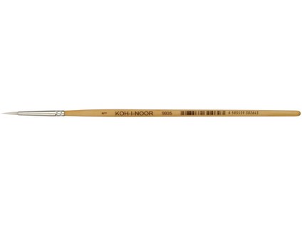 Round synthetic brush for school purposes. Brush size 1. It has natural varnished shank, synthetic white hair and aluminium quiver. Hair length 11 mm, hair diameter 2 mm, handle 135 mm long. Glued-in hair and protected with plastic cover to protect the hair against damage. Tip-shaped glued hair; it can therefore be used for colouring as well as contouring of thin things. Round brush size 1, natural shank varnished with transparent matt UV varnish, aluminium quiver, synthetic white hair, glued, with plastic cover.