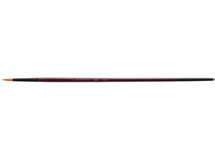 Round synthetic brush for art purposes. Brush size No. 2. The brush has natural varnished shank in red wine colour, synthetic orange hair and aluminium quiver, black varnish. The brush end has black soaking in quiver tone. The brush is suitable for acrylic paints. Tip-shaped hair and protected with plastic cover to protect the hair against damage. The brush length is 293,7 mm. The hair length is 16,5 mm.