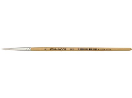 Round synthetic brush for school purposes. Brush size 4. It has natural varnished shank, synthetic white hair and aluminium quiver. Hair length 14 mm, hair diameter 2,7 mm, handle 135 mm long. Glued-in hair and protected with plastic cover to protect the hair against damage. Tip-shaped glued hair; it can therefore be used for colouring as well as contouring of thin things. Round brush size 4, natural shank varnished with transparent matt UV varnish, aluminium quiver, synthetic white hair, glued, with plastic cover. Size: 4 mm, hair diameter: 2,7 mm, hair length: 14 mm, quiver length: 27,8 mm, shank length: 135 mm, shank thickness: 5,3 mm.