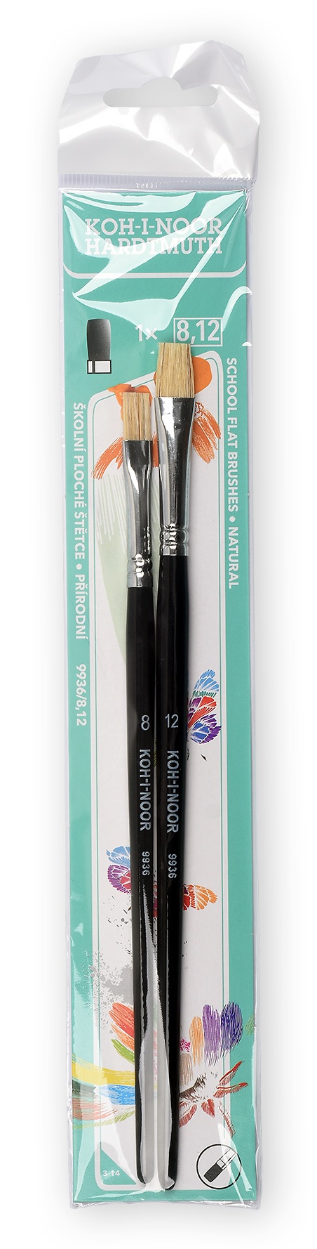 Flat brush for schools. Set of 2 round brushes size 8 and 12 in plastic bag with euro-hanger, with printed paper insert inside. Wooden shank, metal (silver) quiver, “pig” hair. Black shank colour. Set dimensions 320 (including the euro-hanger) x 55 x 10 mm.