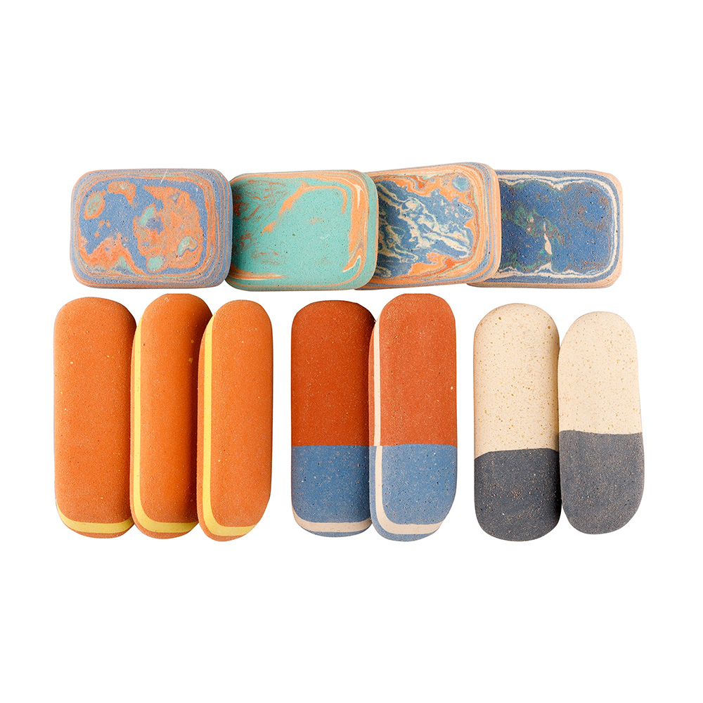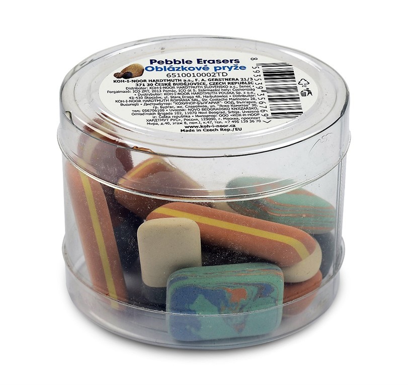 Office pebble natural-based eraser without addition of plastic materials and phthalates. The packaging includes various types of erasers suitable for erasing of graphite and pastels lines, ink stains, and Indian ink. Also suitable for erasing of typewriting machine letters and removing leads.