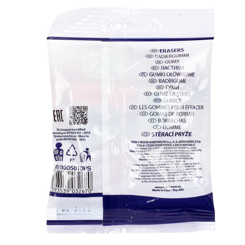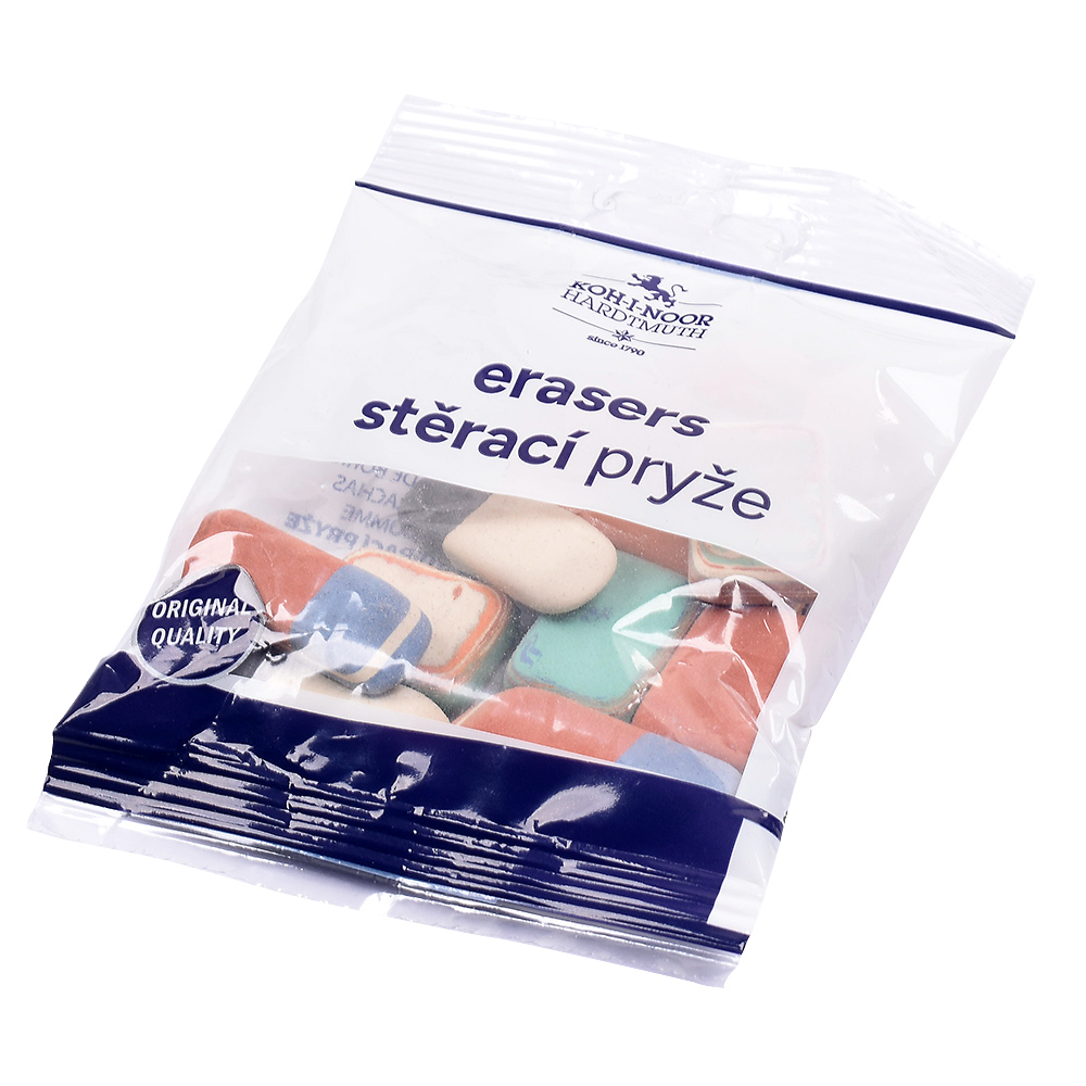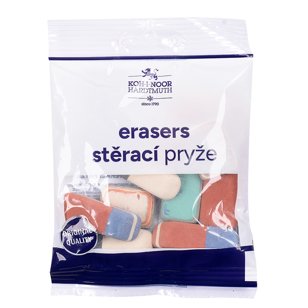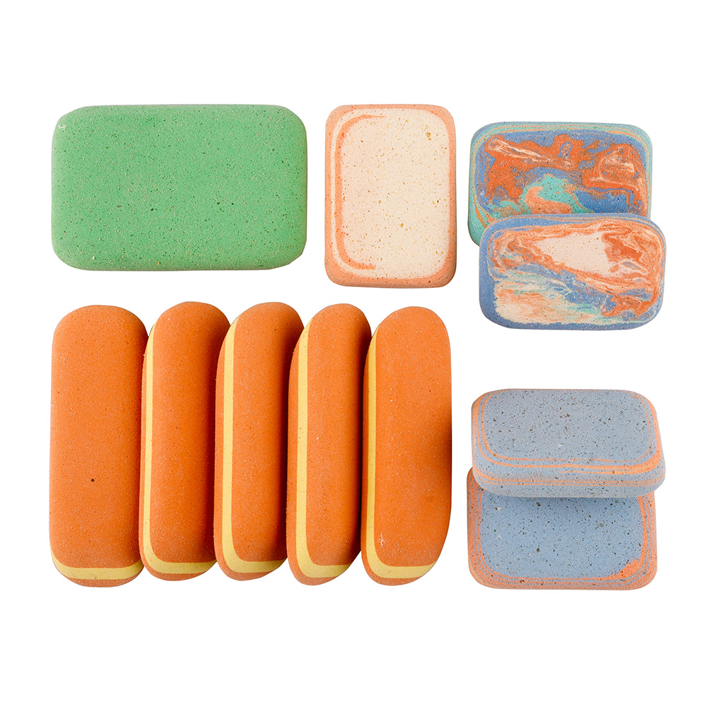 Office pebble natural-based eraser without addition of plastic materials and phthalates. The packaging includes various types of erasers suitable for erasing of graphite and pastels lines, ink stains, and Indian ink. Also suitable for erasing of typewriting machine letters and removing leads.