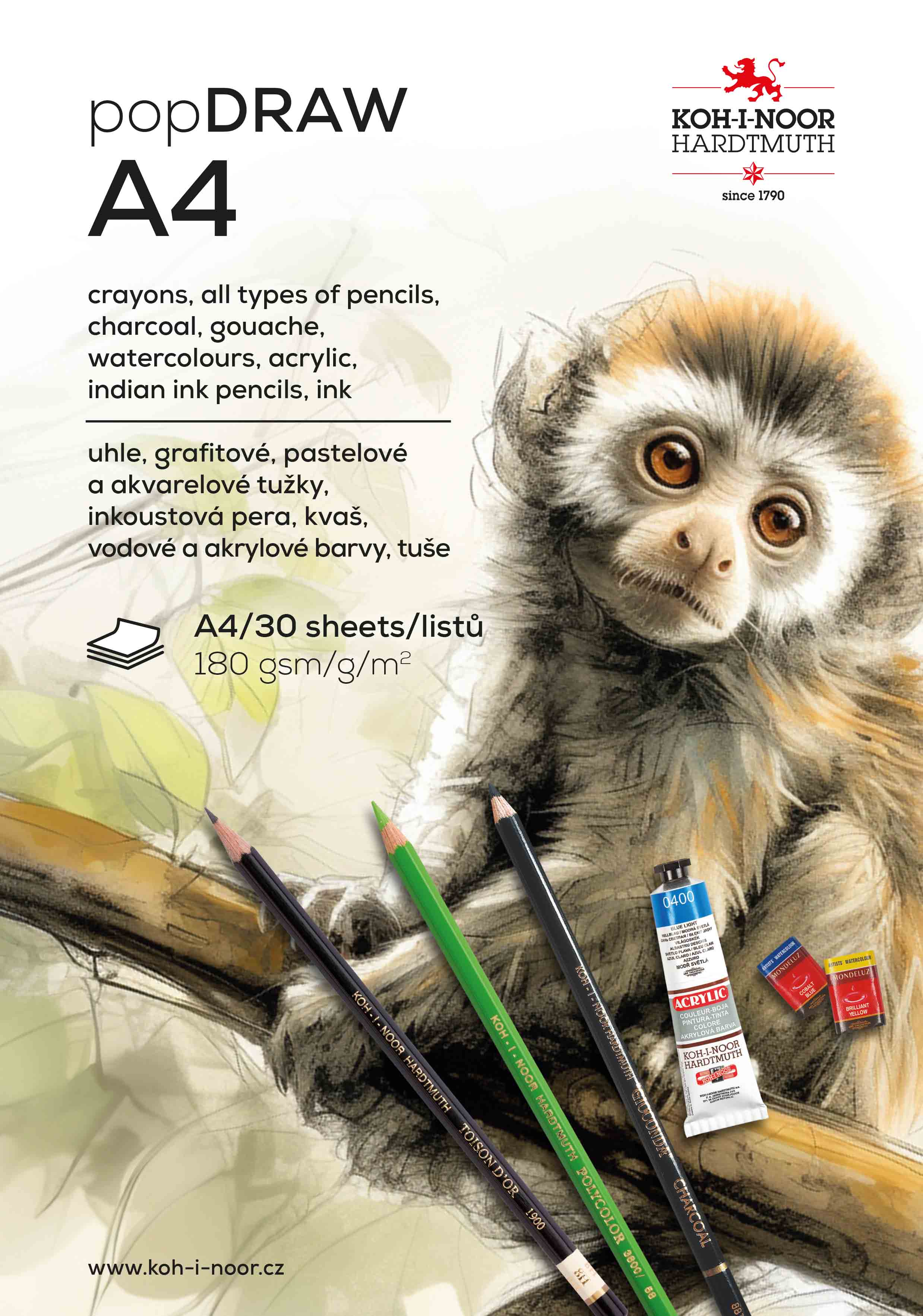 Glued block for charcoal, graphite, coloured and aqaurelle pencils, ink pens, gouache, water and acrylic colours and Indian ink. It contains 30 sheets in format A4 with weight of 180 g/m2. Colour of the sheets is white. Block is glued at the top of the product. (short side)