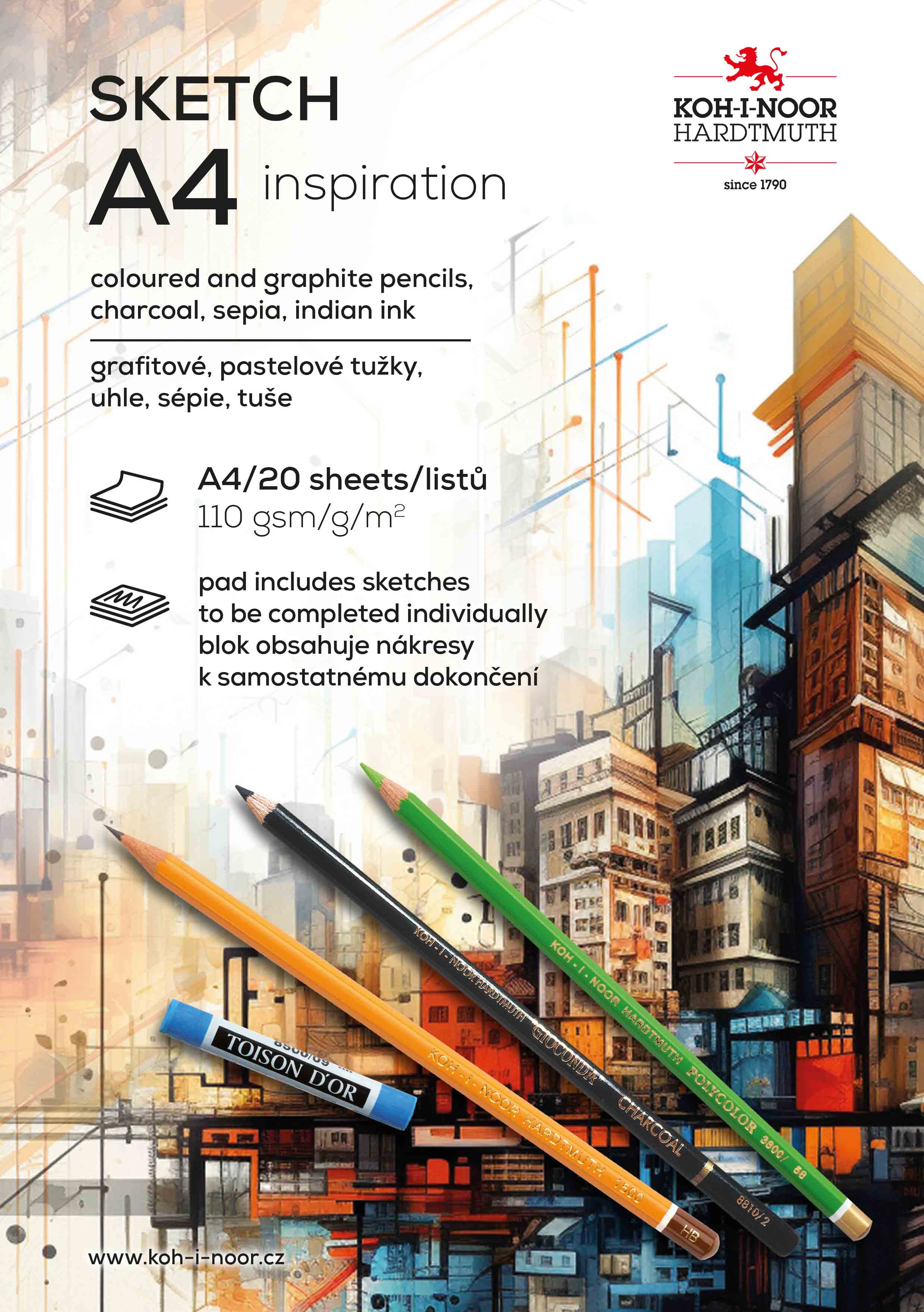 Glued block with printed motives for graphite and coloured pencil, charcoal, sepia and Indian ink. It contains 20 sheets in format A4 with weight of 110 g/m2. Colour of the sheets is yellow. Every sheet of paper has different motive. Block is glued at the top.