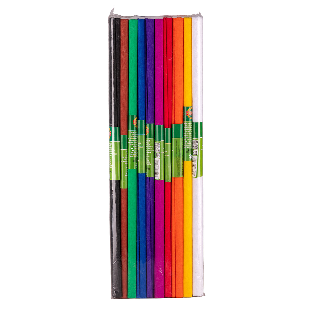 The product is used as a crepe paper for schools, artistic, and window dressing works. A set of crepe paper 10 pcs in the following colours: wine, red, dark orange, light orange, dark yellow, light green, green, turquoise, blue, dark violet. United crepe paper with 2000 x 505 mm dimension is packed into a package of about 505 x 35 x 18 mm. 10 pcs of crepe paper is inserted in the foil. Creping degree 30–40%.
