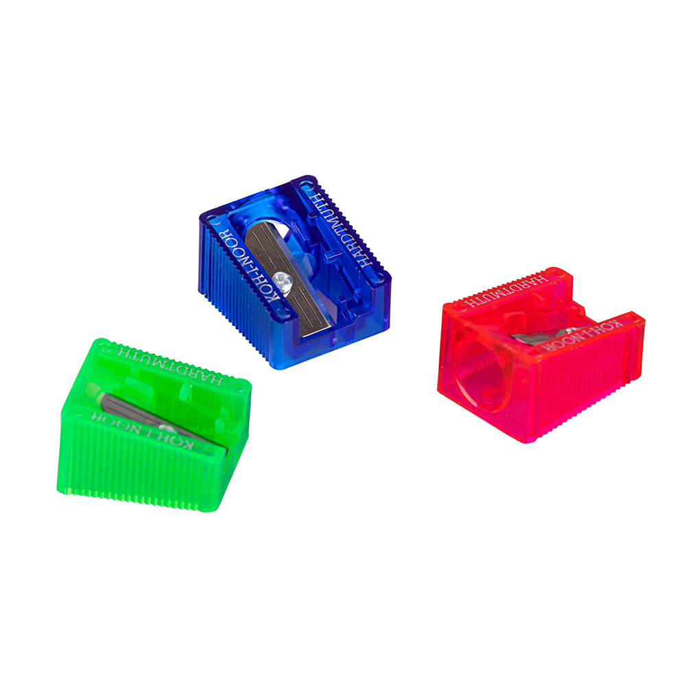 The product is used as sharpener for schools and offices to get a sharp point. Plastic sharpener Ø 12 mm, colours: blue, green, orange, yellow. Serrated sides, bevelled. Length 29 mm, width 24 mm, height 18 mm on the longer side, height 12 mm on the shorter side.