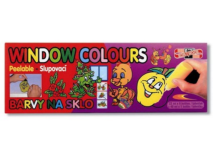Set of 9 pcs of 22 ml and 1 pcs of 40 ml bottles with glass paint in paper box (colours: white, yellow, orange, red, dark blue, blue, violet, light green, dark green, light brown, black contour), attached 2 templates for painting motives, 1 foil, instructions for use, and 2 pare nozzles. The glass paint is used for painting on glass, mirror and tiles. First, the paint is applied right from the bottle to the foil. After drying, the image is carefully peeled off from the foil and attached to a required surface. Not suitable for children under 3 years.