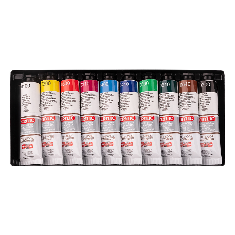 Acrylic paints are water-dilutable dispersion paints of high quality. Can be applied by brush, roller, or spatula to any non-greasy substrate. The colours are characterized by high pigment content and colour light-fastness. After drying, it produces flexible water-resistant coating. Another benefits of the paints is mutual blendability and short drying time.