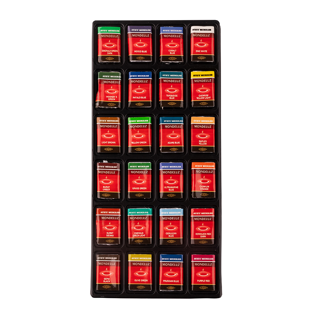 MONDELUZ aquarelle paints are transparent with bright shades, with low covering power, intended for aquarelle-technique painting with hair brush. Delivered in solid state in the form of plastic cuvettes, packed in aluminium foil and identified with a label. Qualitative parameters related to covering power, light-fastness, and composition are always specified on label.