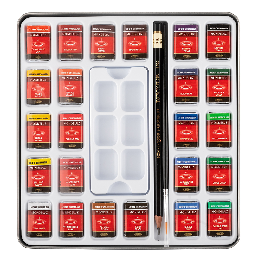 MONDELUZ aquarelle paints are transparent with bright shades, with low covering power, intended for aquarelle-technique painting with hair brush. Delivered in solid state in the form of plastic cuvettes, packed in aluminium foil and identified with a label. Qualitative parameters related to covering power, light-fastness, and composition are always specified on label.