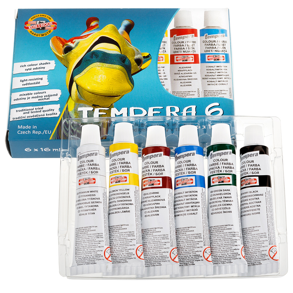 Tempera paints are intended in particular for art lessons in schools but professional painters use them as well. Their quality is high, they are thick, miscible, and dilutable in water. The paint dries quickly and can be liquified after drying with water. The base is finely squashed pigments mixed with an emulsion of suitable oil and binder. Available in many different packaging types.