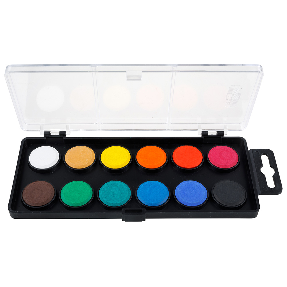 School watercolours in 12 colour shades and 22,5 mm diameter tablets in square, plastic, one-floor colour pads with a transparent lid. The colour shades are bold and characterized with high pigment volume.