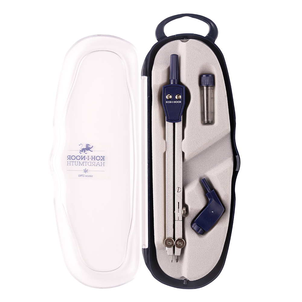 School metal compass intended for drawing circles up to 360 mm in diameter with a clamping diameter of 3,5 mm. The set includes 2 spare leads and universal adapter in the box from firm plastic material with euro hanger. The bottom of the box is dark blue and the lid is transparent. The transparent sticker and locking tab ensures that the box will not be opened accidentally.