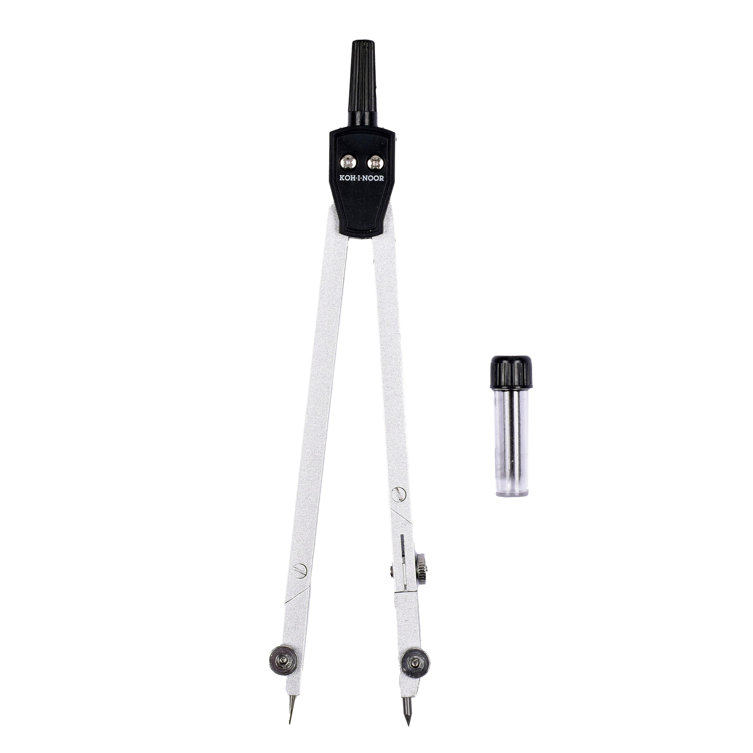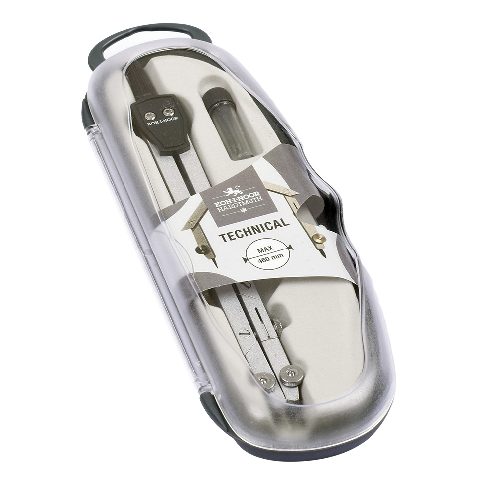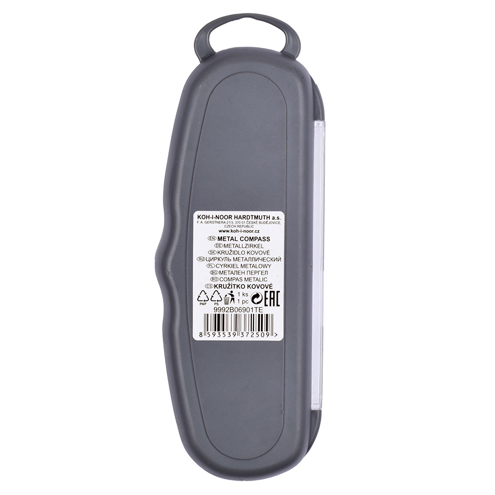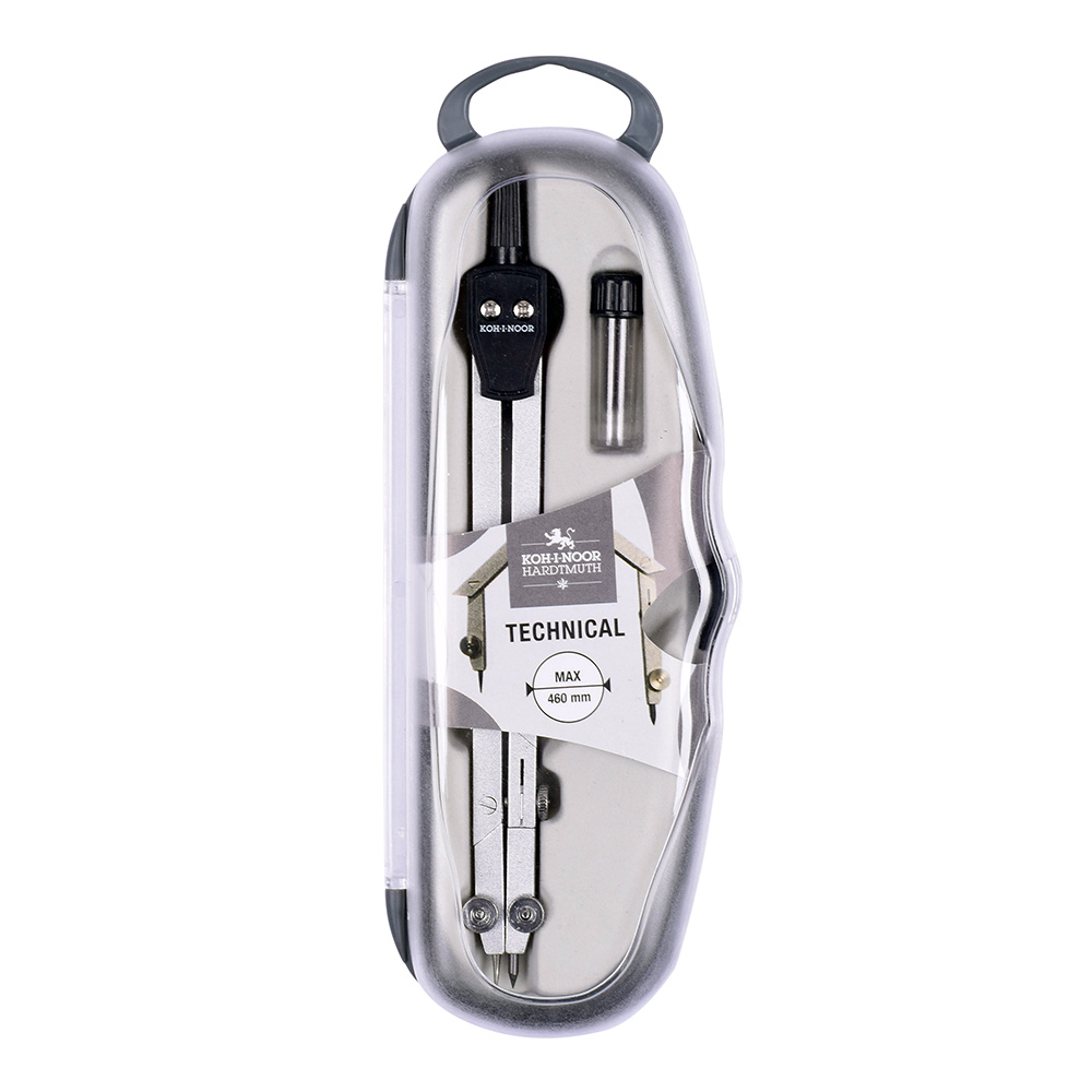 Metal compass is designed for drawing of up to 460 mm diameter circles. Lead holder fixing diameter is 3,5 mm, lead diameter is 2 mm. The set include 2 spare leads in a case. In addition to the snap lock at the point of contact between the upper and lower part, the case is also equipped with a round transparent sticker to prevent accidental opening.
