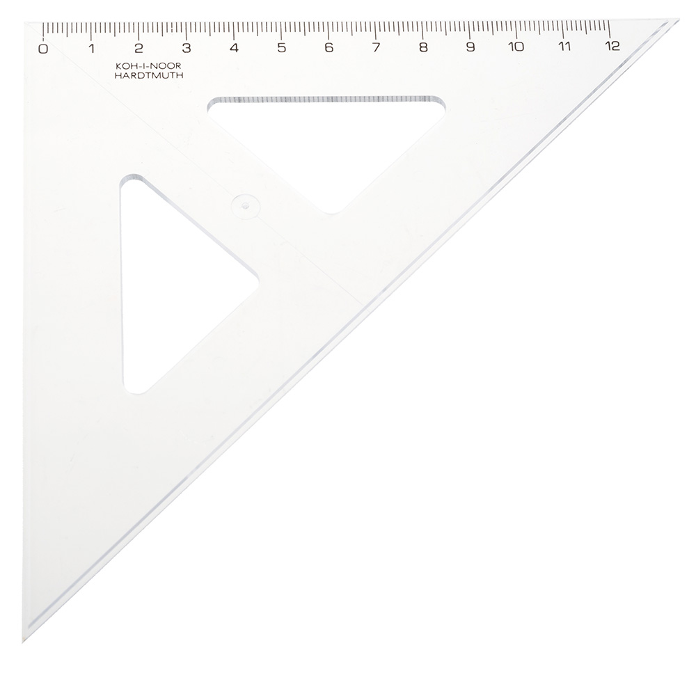 Set square 45/141 with a vertical made from clear transparent polystyrene. The scale printing is resistant to wear and tear in normal use. Scales accuracy 0,2% of length. A line for drawing of verticals is created on the set square in addition to the measurement scale. The set square is designed for drawing and technical drafting in schools and office. Packed in printed polyethylene bag with EURO hanger.