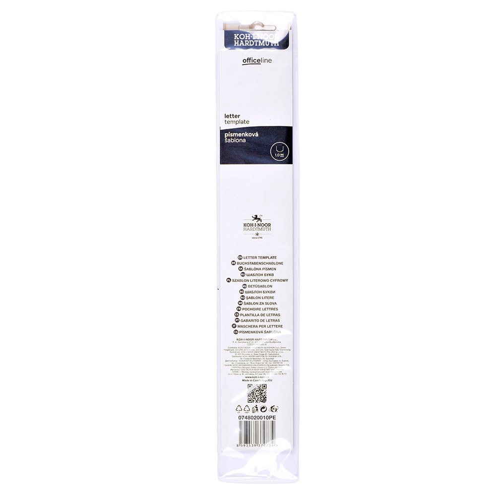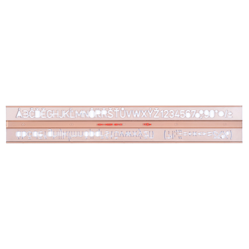 Letter template made from smoky transparent polystyrene. Designed for working with 1,0 mm technical pen. Contains characters of lower case and upper case alphabet, digits, and mathematical symbols. All characters are 10 mm high and in upright face according to ČSN. The template is used for making descriptions in schools and office. Packed in full-transparent polypropylene casing with paper insert and EURO hanger.