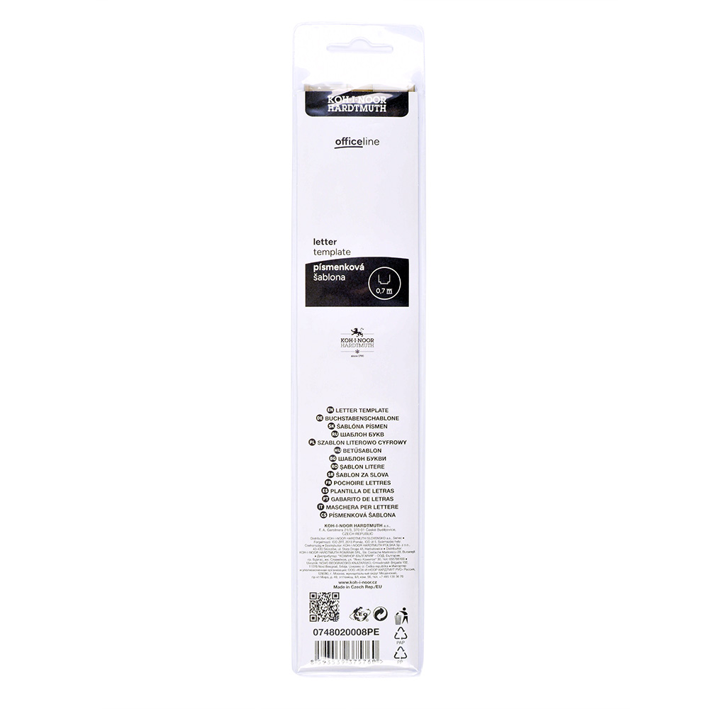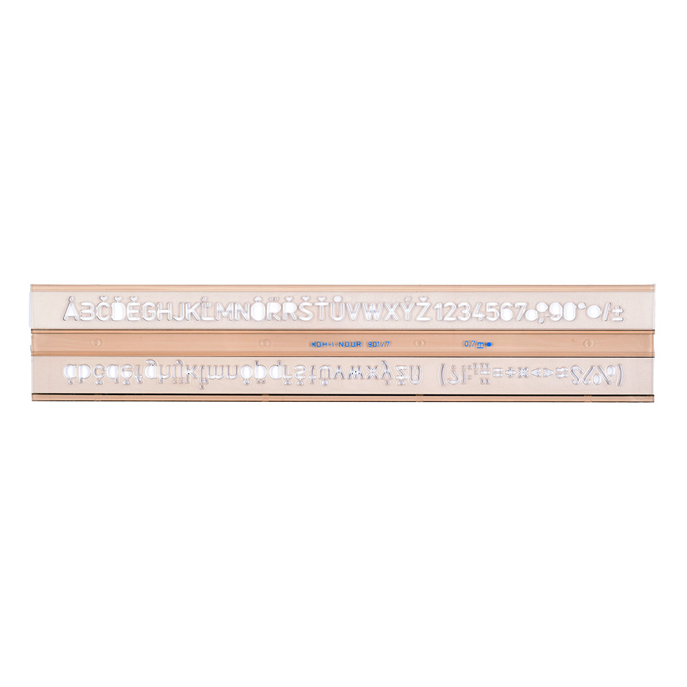 Letter template made from smoky transparent polystyrene. Designed for working with 0,7 mm technical pen. Contains characters of lower case and upper case alphabet, digits, and mathematical symbols. All characters are 7 mm high and in upright face according to ČSN. The template is used for making descriptions in schools and office. Packed in full-transparent polypropylene casing with paper insert and EURO hanger.