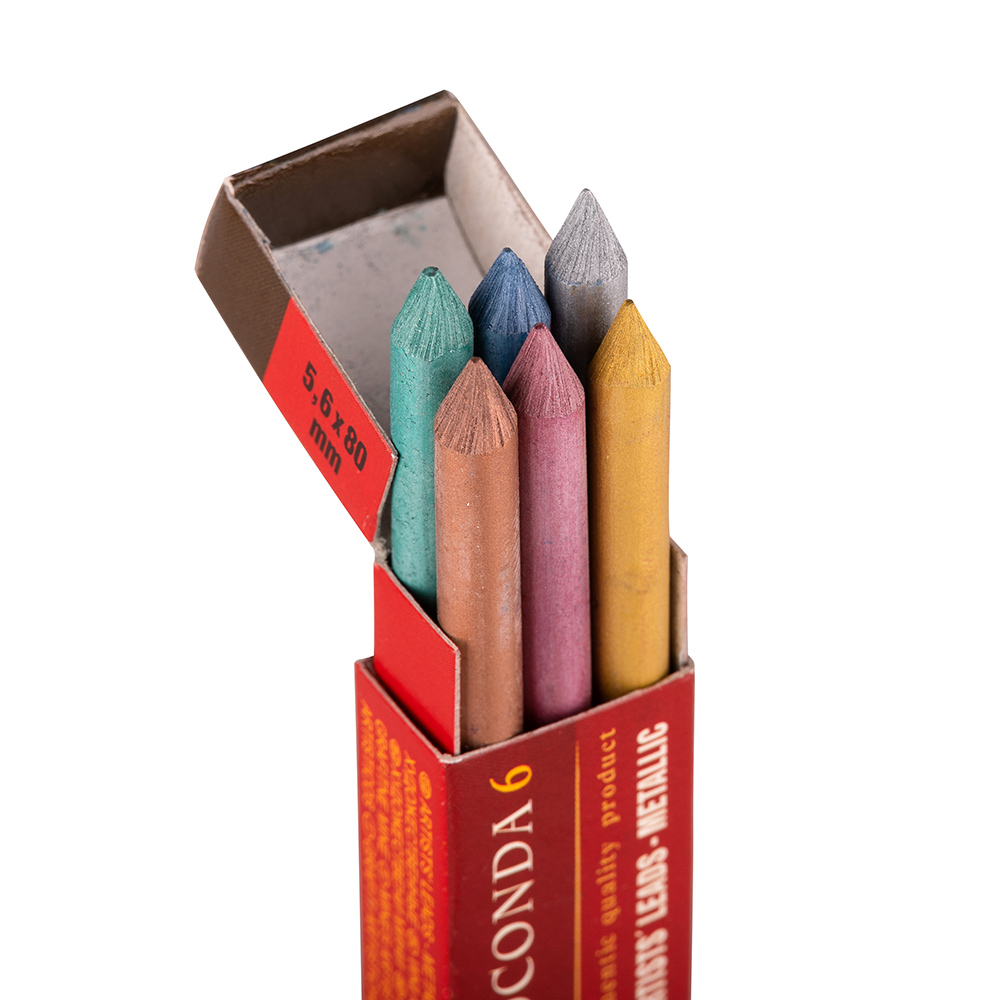 The series of leads with a diameter of 5,6 mm and length of 80 mm was enriched with 6 PCs set of metallic leads with distinctive metallic shine. The set includes these colours: silver, gold, blue, pink, green, bronze. They are suitable for drawing, painting and advertising purposes. It is recommended to use these leads with mechanical pencils "Versatil" Ø 5,6 mm.