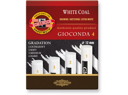 Set of 4 white artificial extra charcoals, diameter of 12 mm and length of 75 mm. The package includes 4 pieces (MIX of hardness degrees) 1, 2, 3, 4. They are suitable for drawings on dark surfaces. The best results are achieved when drawing on black paper.
