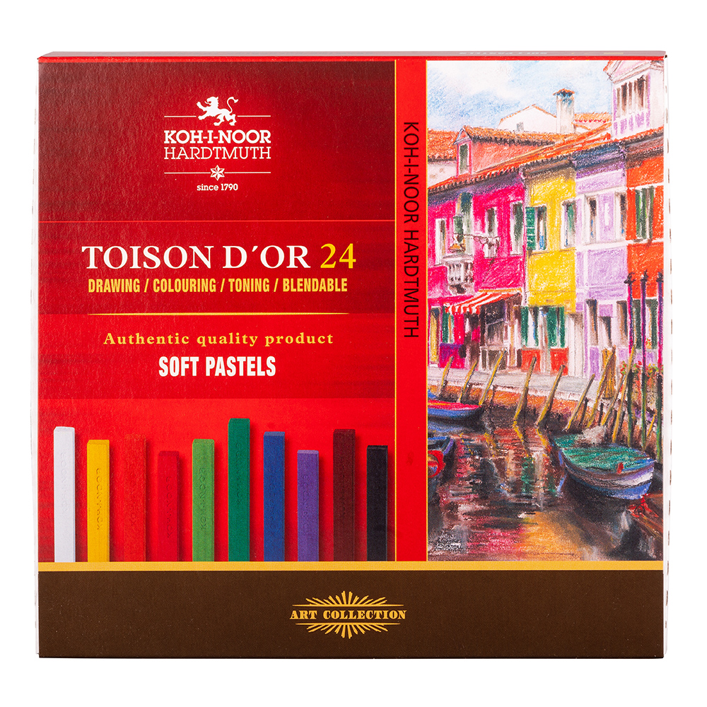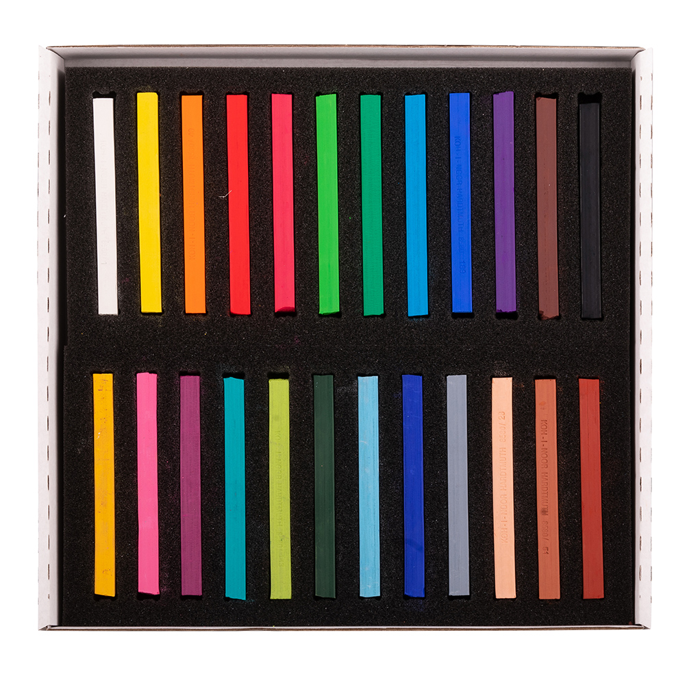 Set of 24 powdery artistic pastels with a harder structure, square profile, 7 x 7 mm and length of 75 mm. These pastels are used for thin and contour lines. Ground pumice is used as a filler.