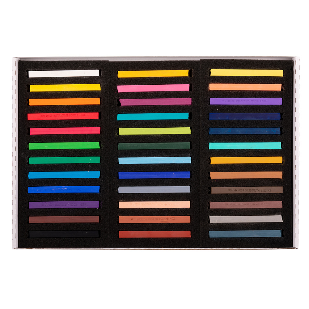 Set of 36 powdery artistic pastels with a harder structure, square profile, 7 x 7 mm and length of 75 mm. These pastels are used for thin and contour lines. Ground pumice is used as a filler.