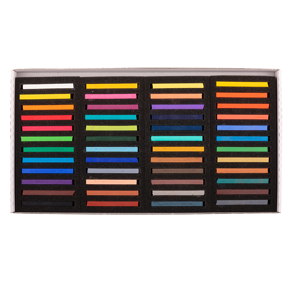 Set of 48 powdery artistic pastels with a harder structure, square profile, 7 x 7 mm and length of 75 mm. These pastels are used for thin and contour lines. Ground pumice is used as a filler.