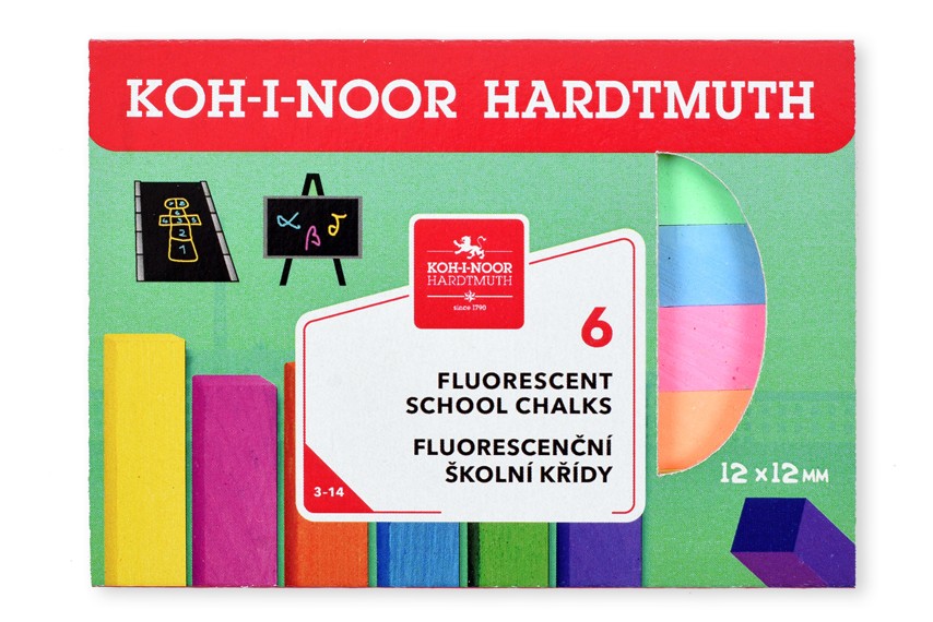 Set of 6 pieces of square fluorescent school blackboard chalk 12x12x100 mm, designed for writing on a blackboard or for drawing on pavements and other asphalt or concrete surfaces, inserted in a box with a printed sleeve.