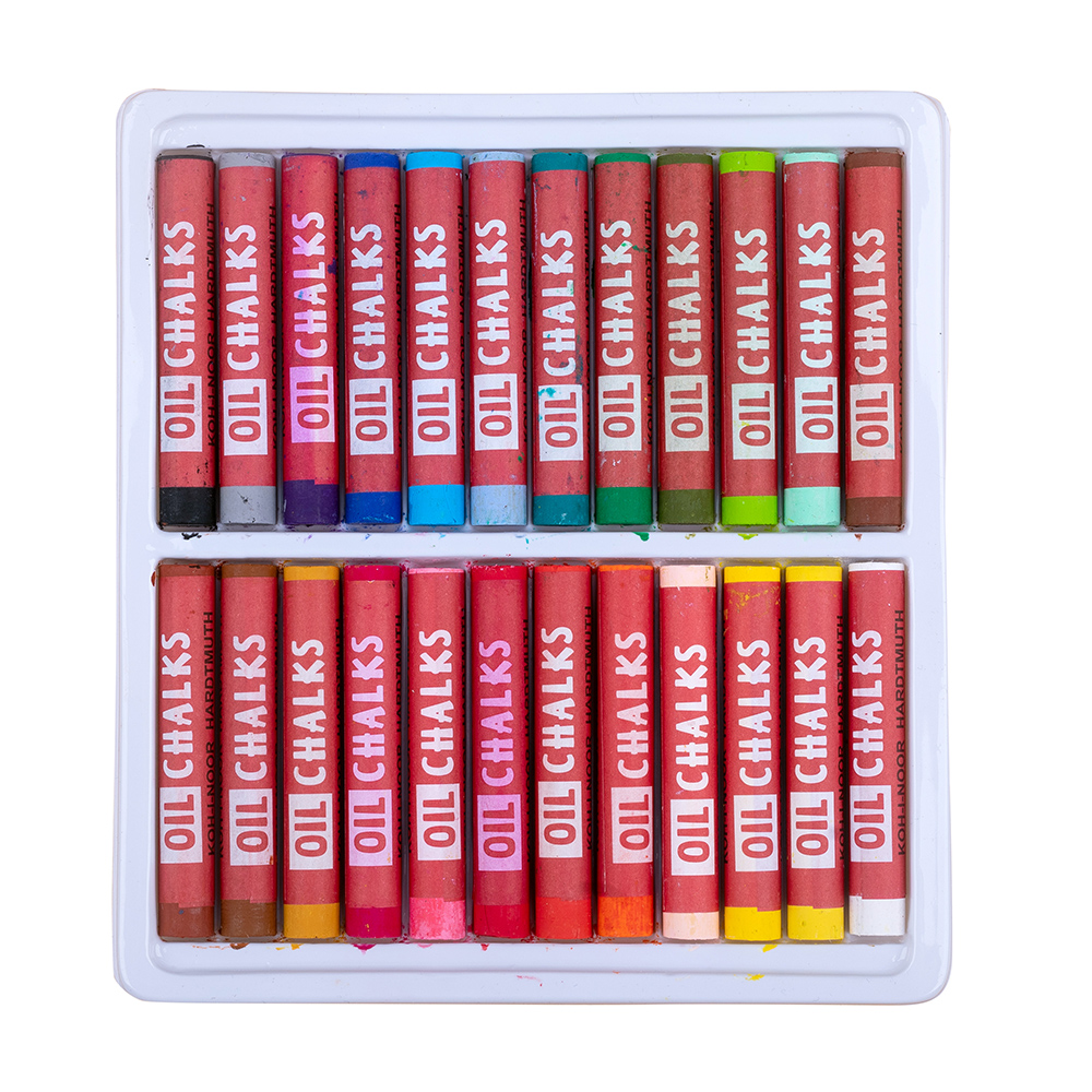 A set of oil chalks for school use, window dressing, and artistic drawing. A set of 24 pieces of oil chalks with dimensions Ø 8,9 mm, length 60 mm. Each oil chalk is wrapped in red-white label with black-red-white text KOH-I-NOOR HARDTMUTH OIL CHALKS. The oil chalks are packed in a paper printed box with euro-hanger in 24 shades. Dimension of 1 piece Ø about 8,9 mm, length 60 mm.