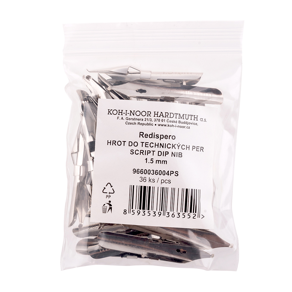 Set of 36 nibs in closable OPP bag. 36 pieces of nibs for technical pens with width of 1,5 mm inserted into closable OPP bag.