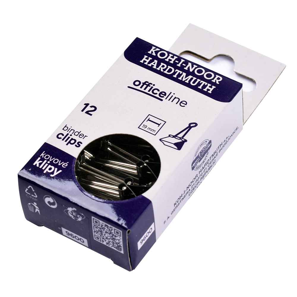 Metal clips 19 mm, height 37 mm, width at the widest point 19 mm. Pressing mechanics is black, pressing holders are nickel-coated. 12 clips in a printed box. The clips are used e.g. to clipping of multiple papers.