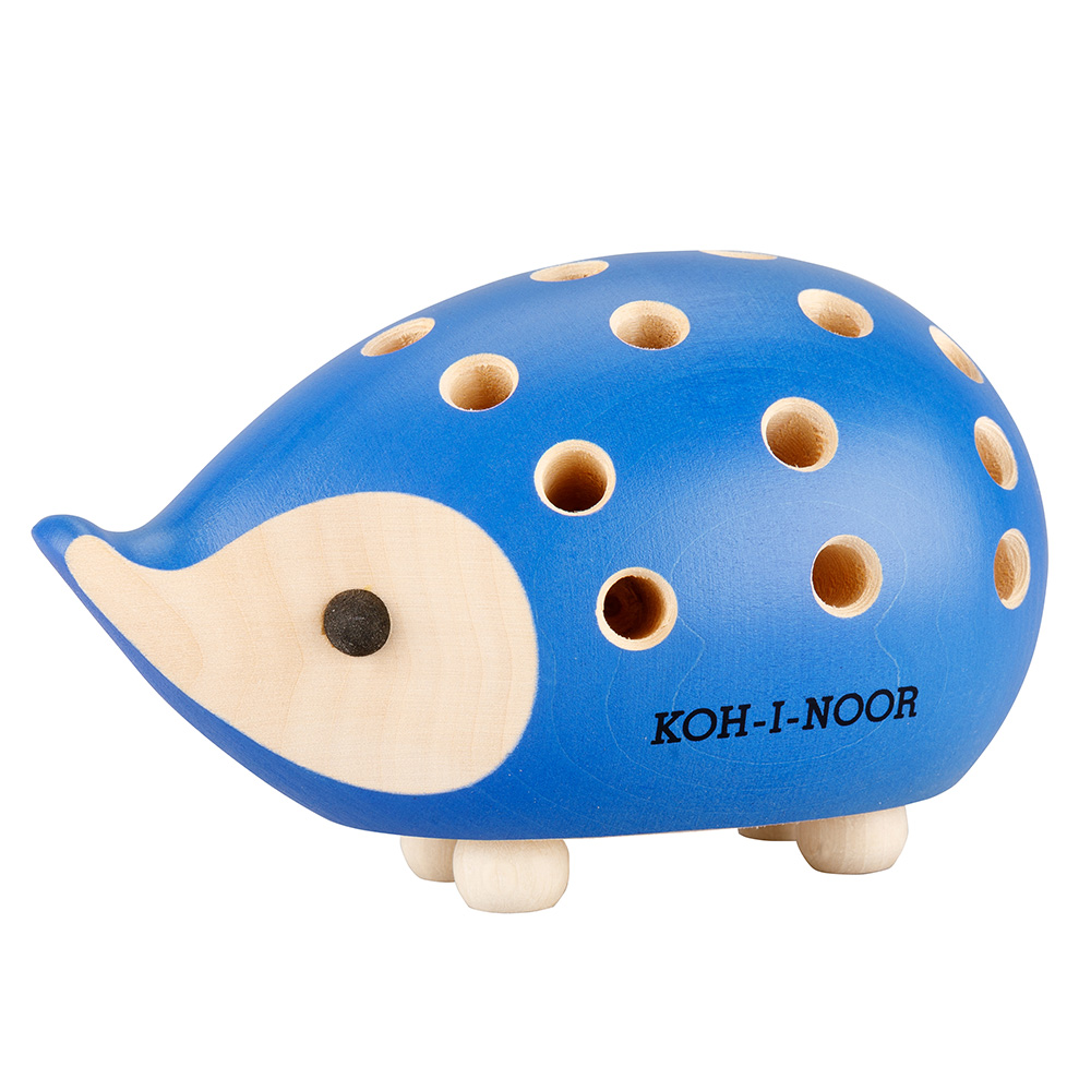 small wooden hedgehog with pencils blue