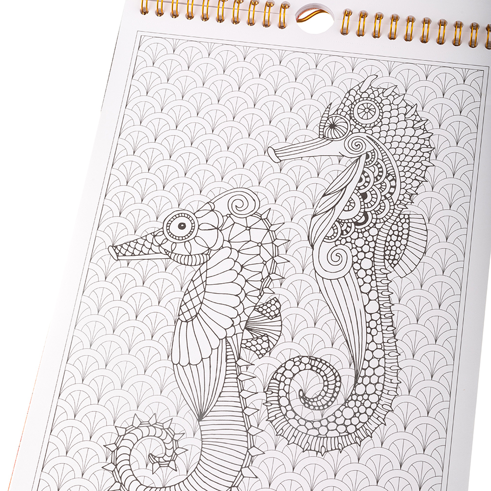 Colouring book for adults. Colouring book for adults is a block of A4 size bind in spiral binding in the upper part with holder for hanging. With strong paper boards on front and rear side. Block dimension 210 x 297 x 8 mm. In total, the block contains 128 pages of colouring pages. FSC. Block dimensions including the spiral binding: 210 x 300 x 8 mm.