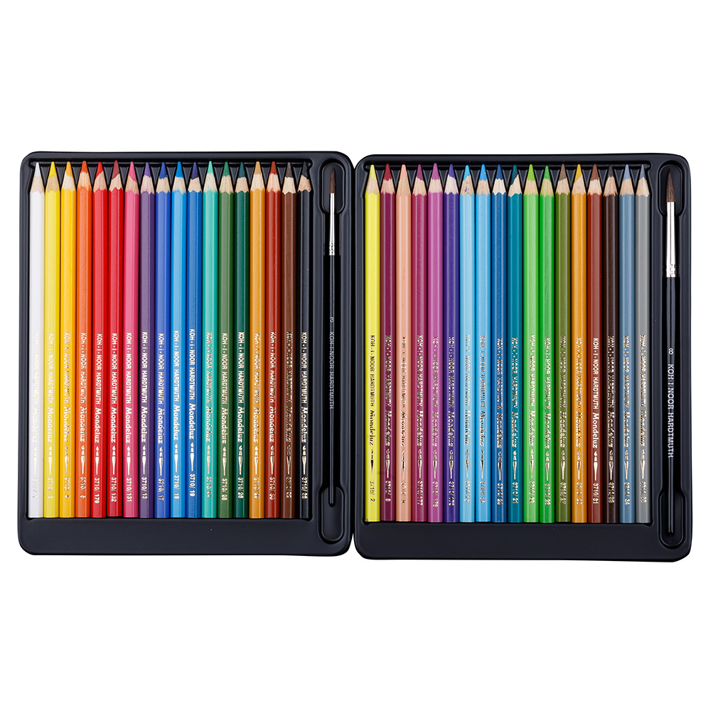 A set of watercolour coloured pencils for artists. The pencils are fitted with high quality 3,8 mm diameter lead with excellent writing properties and brilliant tones. Further, the set includes brushes and a quality sharpener. The coloured pencils are suitable for artists, hobby use, and common drawing.