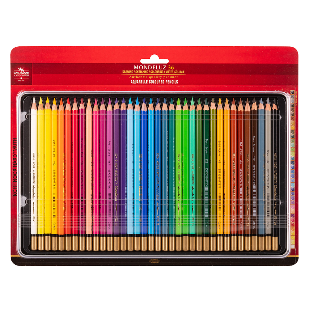A set of 36 pcs of watercolour coloured pencils in a metal box. The pencils are hexagonal OK - 7mm and boast a high quality strongly pigmented core of diameter 3.8mm. The surface finish of these pencils is top-rate, the knob is lacquered and the pencils feature golden labelling. These pencils are characterized with an intense colour trace which presents an option to adjust the drawing by water applied by a brush or sponge. Suitable for both artistic and hobby drawing.
