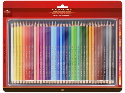 Set of 36 pieces of top quality coloured pencils with heavily pigmented core with a diameter of 3,8 mm in a metal box. Pencils have excellent surface finish, lacquered ending and gold labelling. They are characterized by rich mark and can be further modified by blending. Suitable for artistic and hobby drawing.
