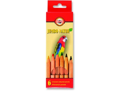 Hexagonal colour pencils OK-10 mm in wooden envelope, natural design, grooving on surface, 6 colour shades. Massive pencil profile suitable for grip and guiding of the pencil. Packaging of 6 pcs of mixed colour shades in a cardboard box. Suitable for school and artistic drawing.