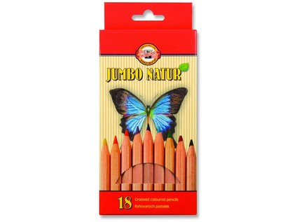 Hexagonal colour pencils OK-10 mm in wooden envelope, natural design, grooving on surface, 18 colour shades. Massive pencil profile suitable for grip and guiding of the pencil. Packaging of 18 pcs of mixed colour shades in a cardboard box. Suitable for school and artistic drawing.