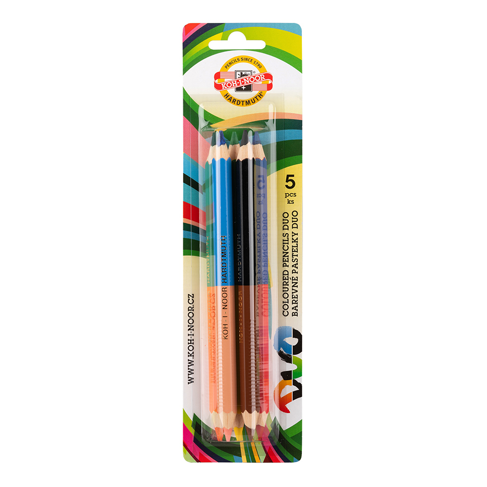 Wooden coloured pencils OK 10 – DUO with quality colour lead. A different colour lead is inserted in each half of the coloured pencil. In this way, favourable use of 10 colours in 5 pencils is possible. Suitable for schools of all levels. Always varnished one half of the pencil in the lead colour.