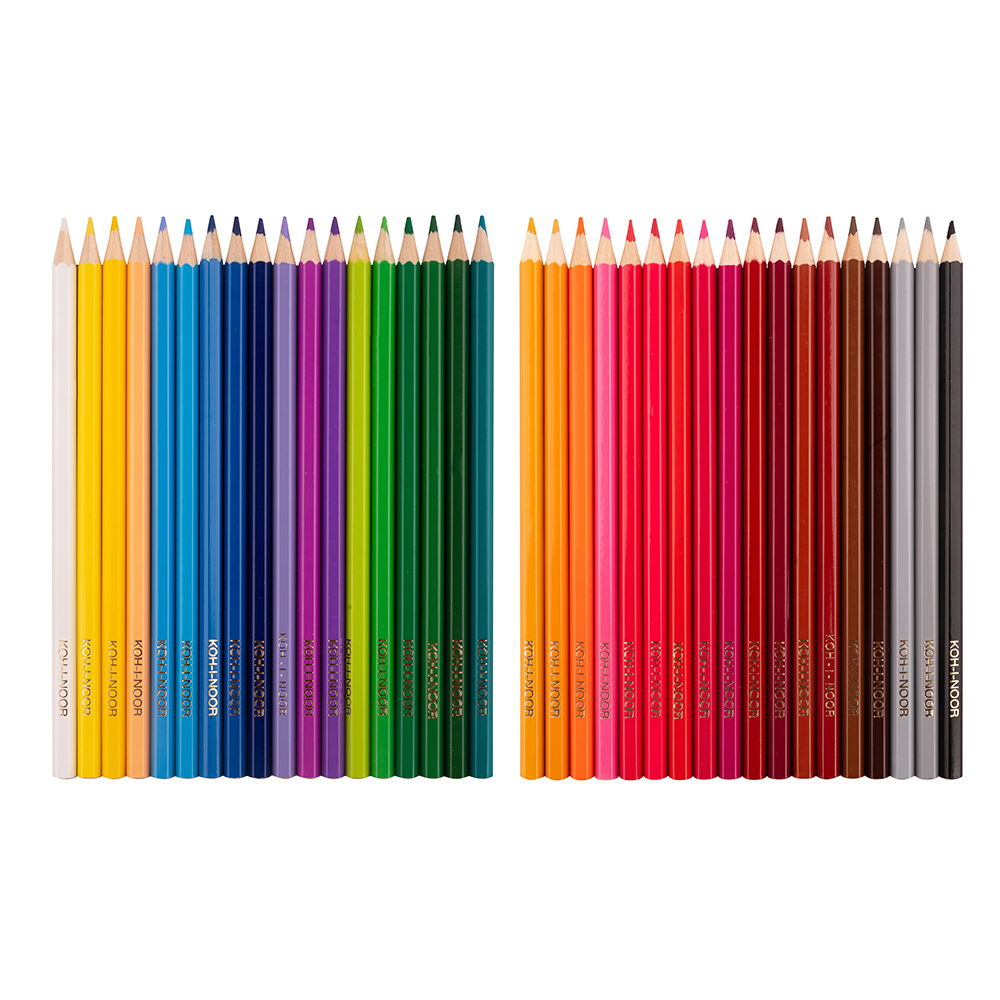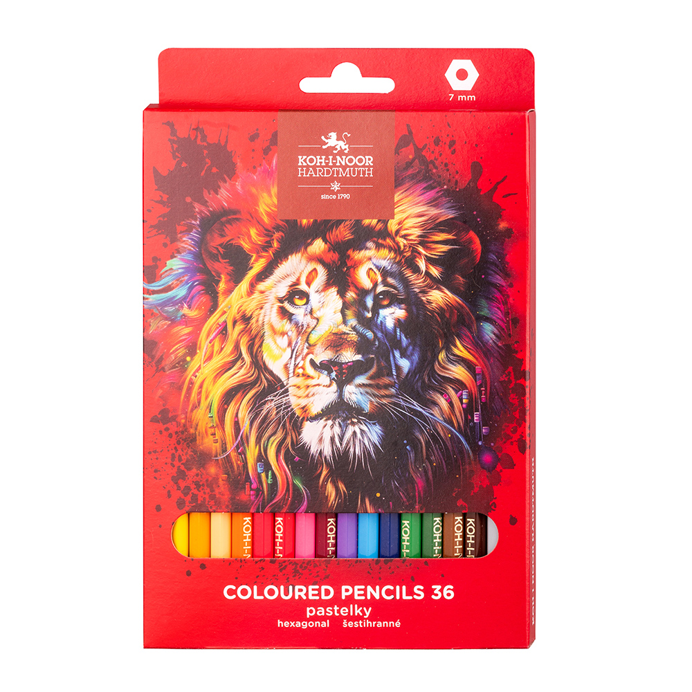 A set of hexagonal coloured pencils. The pencils have a wooden casing and are packed in sets of 36 shades in a cardboard box. The pencils will leave an intense trace and are suitable for both school and universal use.