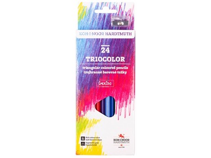 Triangular coloured pencils in a wooden casing. 24 colours are packed in a cardboard box + a pencil sharpener is provided. The ergonomic triangular shape allows for optimum grip and guiding the pencil. These pencils are designed for creative and professional use.